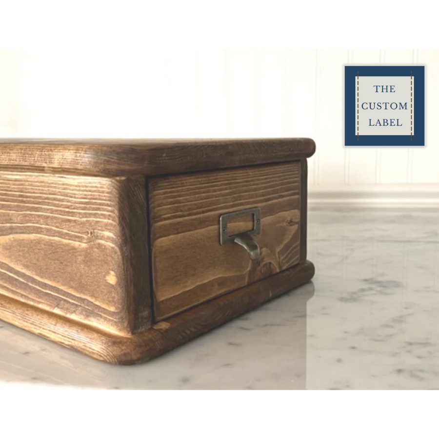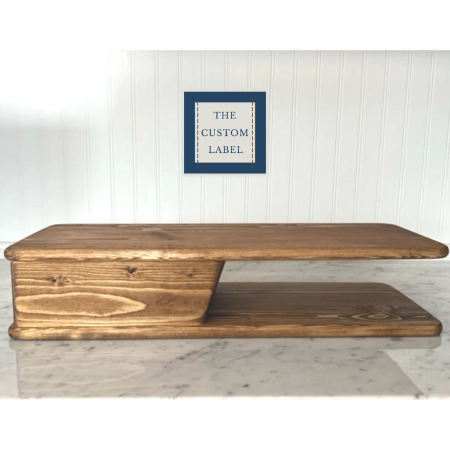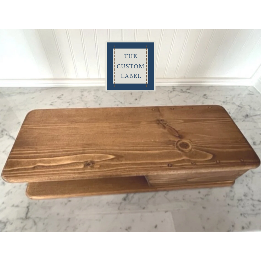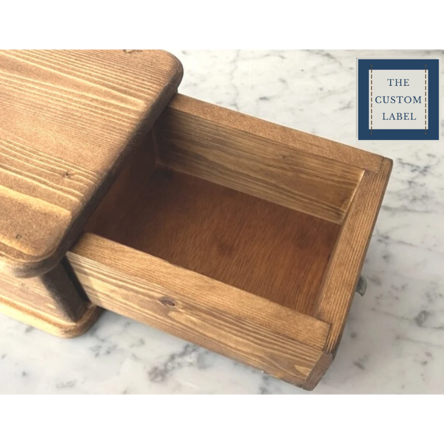 Each riser is made of top grade, solid pine edge glued boards to avoid any cupping or warping. Screwed together with wood plugs added, then sanded and buffed. Ready for you to finish to your liking or choose light or dark Danish oil for a lovely finish. An antiqued bronze drawer pull adds the final elegant touch.